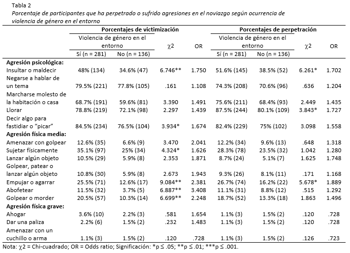 La prevalencia de la violencia en las relaciones de noviazgo está relacionada con la existencia de casos de violencia de género en el entorno más próximo, esto es, el porcentaje de personas que perpetran y/o sufren agresiones en el noviazgo es significativamente mayor entre quienes informan de violencia de género en su entorno (véase Tabla 2). Por un lado, en cuanto a la subescala de victimización, un mayor porcentaje de estas ha sufrido agresiones psicológicas –como insultos, maldiciones y otras palabras molestas– y agresiones físicas –como empujones, inmovilizaciones físicas, bofetadas, golpes y mordiscos– por parte de su pareja. Por otro lado, en cuanto a la subescala de perpetración, estas ejercen significativamente más agresiones psicológicas –insultar o maldecir– y agresiones físicas –empujar o agarrar– contra su pareja.