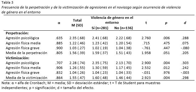 Teniendo en cuenta que la escala utilizada (M-CTS) mide el número de veces que ha tenido lugar cada conducta violenta (1, nunca; 2, rara vez; 3, algunas veces; 4, a menudo; 5, muy a menudo), se ha estudiado la frecuencia de cada una de las formas de agresión: psicológica, física media y física grave. En la Tabla 3 se recogen las diferencias entre quienes informan de violencia de género en su entorno y quienes no. Los resultados, al comparar las puntuaciones de ambos grupos, reportan diferencias estadísticamente significativas, aunque los tamaños del efecto no son elevados. La frecuencia de la perpetración y de la victimización de agresiones en el noviazgo es mayor entre las personas en cuyo entorno ha tenido lugar algún caso de violencia de género.