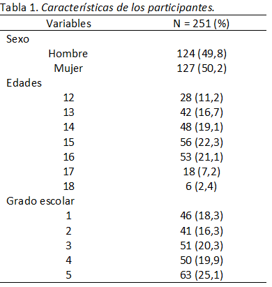 La muestra estuvo conformada por 251 estudiantes de la Institución Educativa Secundaria “Nuestra Señora del Perpetuo Socorro”, ubicada en la ciudad de Puquio, provincia de Ayacucho. Los estudiantes se encontraban matriculados en el período 2019, turno mañana. Los criterios de inclusión fueron: estudiantes matriculados que cursan sus estudios en la institución educativa, haber aceptado participar en la investigación previa firma del asentimiento informado. Los criterios de exclusión fueron: estudiantes retirados o trasladados a otra institución, estudiantes que no deseen participar en la investigación, cuestionarios no resueltos. Para una mayor representación, se consideró toda la población (muestreo censal), siendo viable su aplicación.